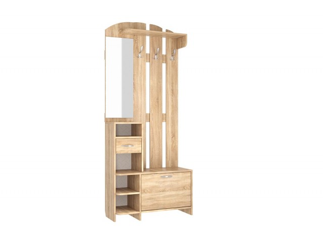 Прихожая Мила состоит из полок, вешалки с крючками для одежды и сумок, обувницы, открытых полок, зеркала, полки для головных уборов, выдвижного ящика. Сборка универсальная. Мила создана для Вашей прихожей – Вы можете повесить одежду и сумку на металлические крючки, шляпки положить на полку сверху, нужные мелочи – в выдвижной ящик. На открытых полках можно разместить зонты, перчатки и шарфы. Есть зеркало и обувница.