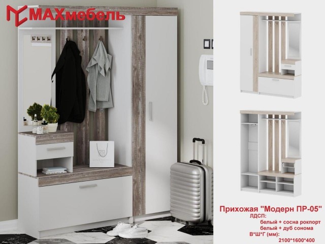Прихожая Модерн ПР-05 – это максимум функциональности: зеркало, ящик на шариковых направляющих для хранения мелочей, вместительная ниша под обувь, платяной шкаф, открытые крючки, место чтобы присесть.