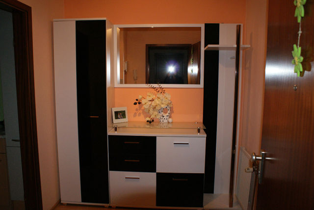Прихожая комплектуется прямоугольным навесным зеркалом. Фасад имеет комбинированную черно-белую расцветку. Боковая часть дополнена открытой полкой для головных уборов.