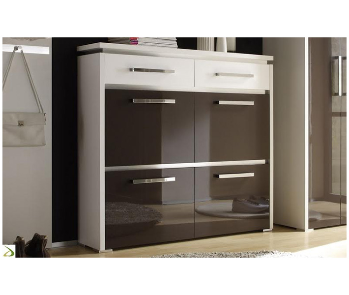 Модульная прихожая состоит из четырех элементов: двустворчатого шкафа, тумбочки, панели с крючками для одежды и сумок, а также прямоугольного зеркала. Створки мебели оснащены удобными хромированными ручками. В оформлении используется белый и коричневый цвета, которые хорошо друг друга дополняют.