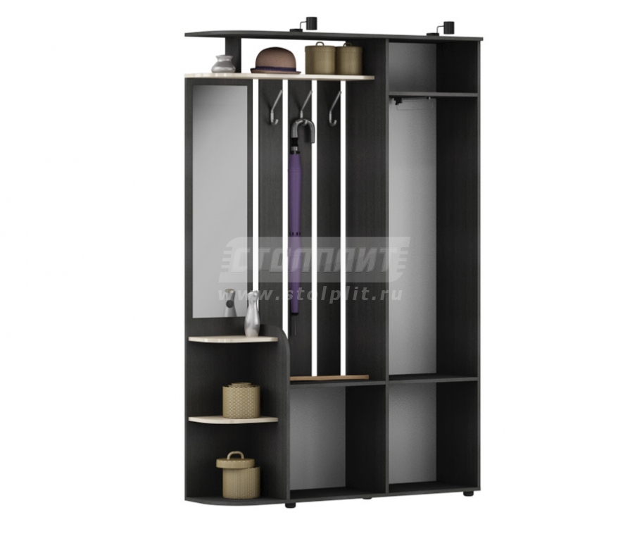 Прихожая «Мона СБ 2292» имеет все необходимое для данного предмета мебели. Конструкция включает в себя высокое зеркало, шкаф для одежды, тумбу для обуви, несколько открытых полок и крючки для одежды.