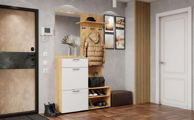 Прихожая с вешалкой, шкафом, комодом, тумбой и зеркалом.