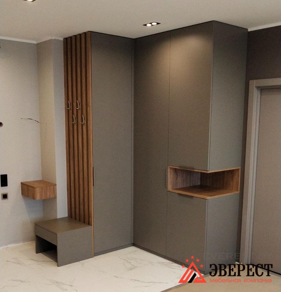 Матовые фасады серого цвета. Вместительная система хранения. Модуль с крючками.