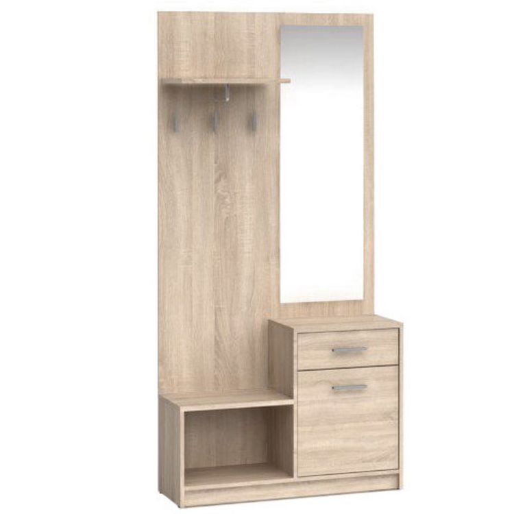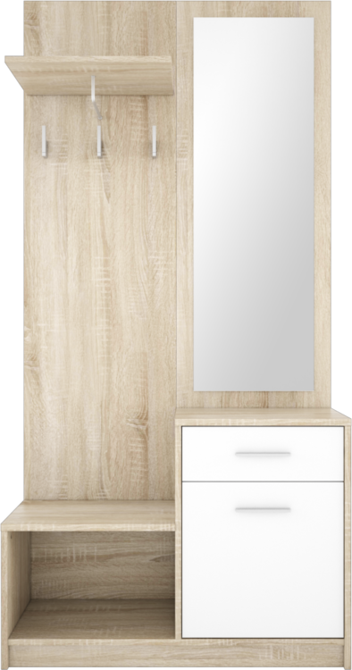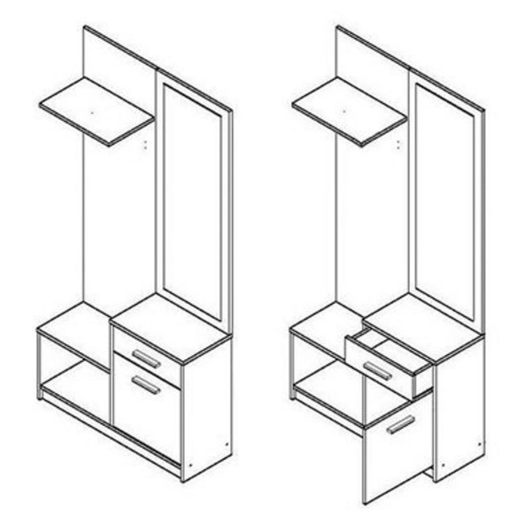 код 112990Включает в себя: тумбу для обуви, удобный ящик, вешалки, верхнюю полку и зеркало - все, что вам нужно.