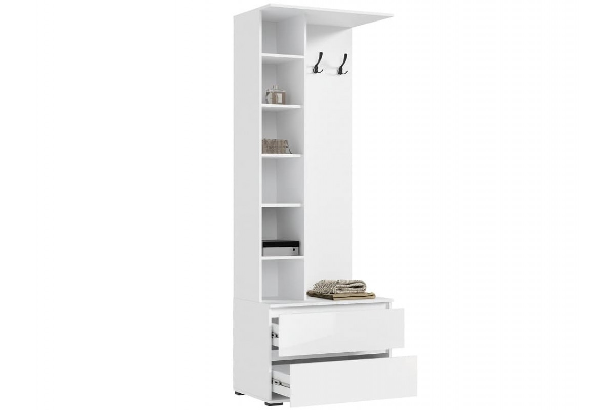 Практичная тумба с зеркалом, шкаф со штангой, вешалка для одежды и полки для вещей.