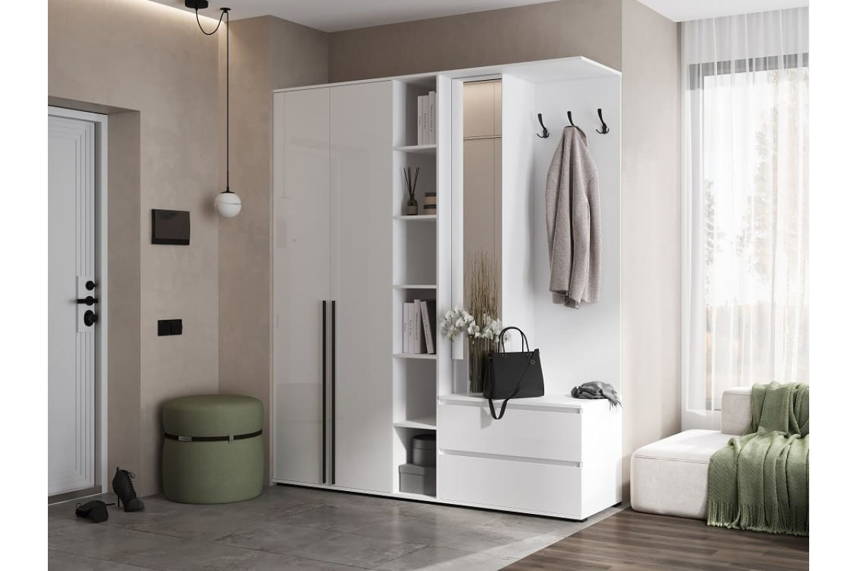 Состоит из отдельностоящих модулей: шкафа+ вешалки+ зеркала и обувниц.