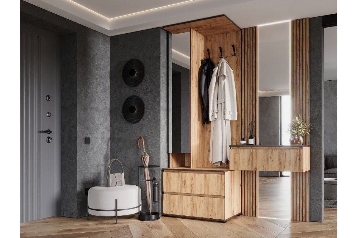 Прихожая выполнена в современном стиле – сочетает в себе функциональность и эффектный внешний вид.