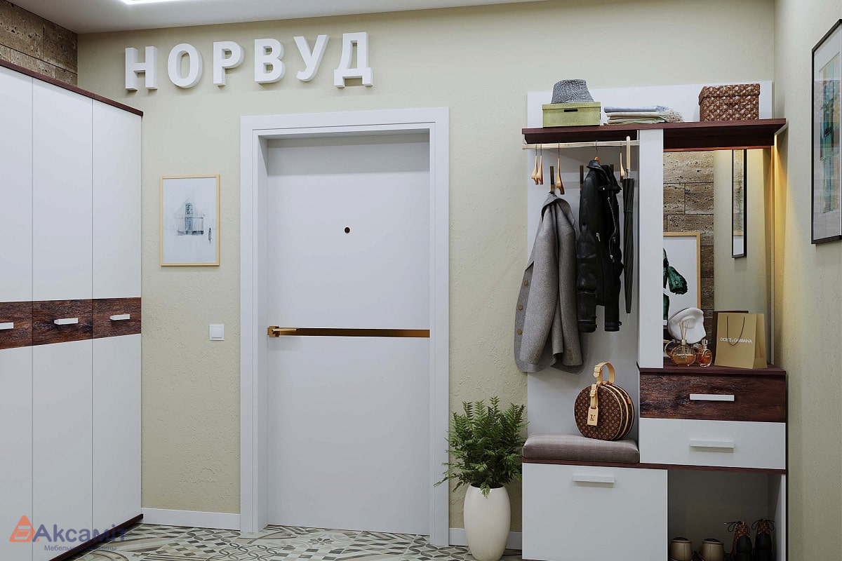 В прихожей Норвуд Белый декор используется в качестве основного цвета. При этом помещение не будет выглядеть просто, так как в дизайне модулей Норвуд используются контрастные горизонтальные поверхности и брашированные деревянные вставки в декоре Орех Шоколадный. Выразительное сочетание актуальных декоров не останется незамеченным и привнесет теплоту в атмосферу вашего дома.