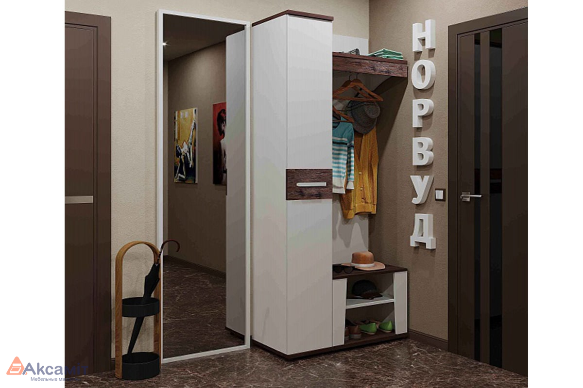 В прихожей Норвуд Белый декор используется в качестве основного цвета. При этом помещение не будет выглядеть просто, так как в дизайне модулей Норвуд используются контрастные горизонтальные поверхности и брашированные деревянные вставки в декоре Орех Шоколадный. Выразительное сочетание актуальных декоров не останется незамеченным и привнесет теплоту в атмосферу вашего дома.