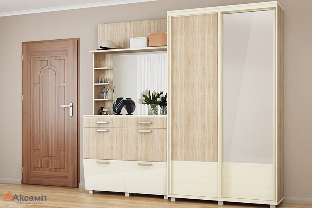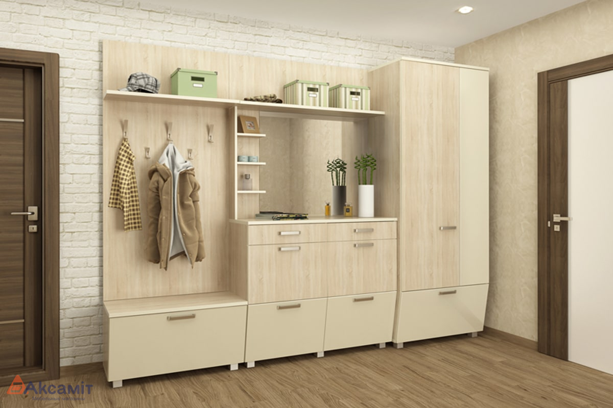 В состав комплекта входит: вешалка, тумба, шкаф, тумба под обувь.