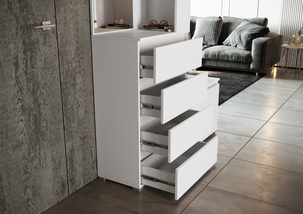 Прихожая с вешалкой, шкафом, комодом, тумбой и зеркалом.
