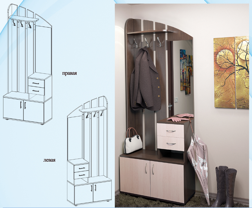 Прихожая «Прованс» - это компактная прихожая с открытыми крючками для верхней одежды. Прихожая включает в себя все необходимые элементы: крючки для одежды, выдвижные ящики, тумбу для обуви и зеркало. Прихожая изготавливается из ламинированной ДСП 18 мм. Исполнение может быть левостороннее и правостороннее (определяется по выдвижным ящика).