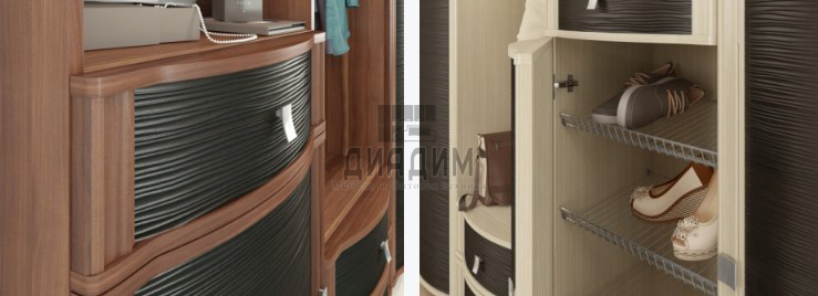 Корпусная мебель для прихожей "Роберта" - это модульная мебель. Она состоит из 24 модулей, с помощью которых можно составить огромное множество вариантов готовых композиций. В популярном сферическом фасаде использованы оригинальные вставки с "волновой" трехмерной геометрией. Мебель изготавливается из высококачественных материалов: ЛДСП, МДФ (фасад), зеркала с фацетом.