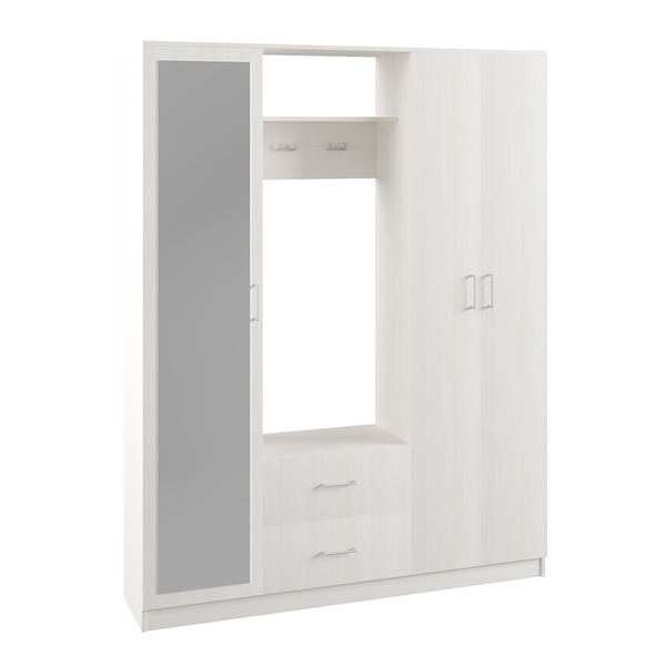код 107334Оснащена фасадом с зеркалом, распашным шкафом, ящиками и вешалкой.