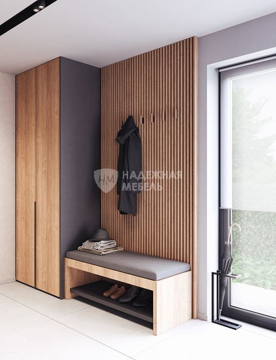 Шкаф с интегрированными ручками, панель с крючками, полка для обуви.