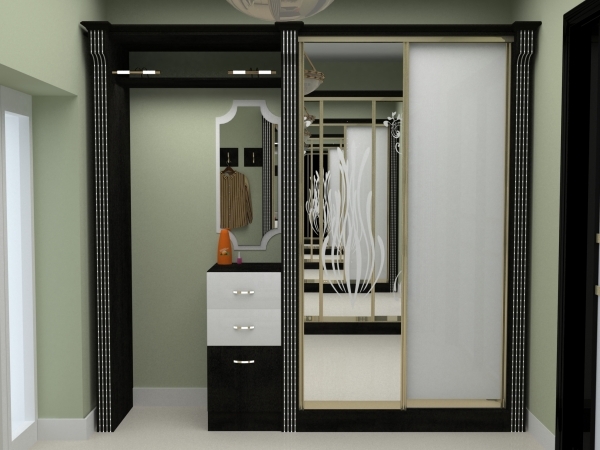 Прихожая обладает оригинальным внешним видом. В первую очередь, такая прихожая подкупает своим современным дизайном и универсальностью. Двустворчатый шкаф-пенал оснащен большим зеркалом с пескоструйным рисунком.