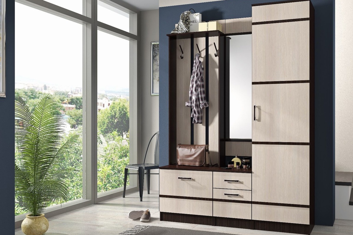 Универсальный набор мебели для узкой прихожей в темном древесном оттенке.