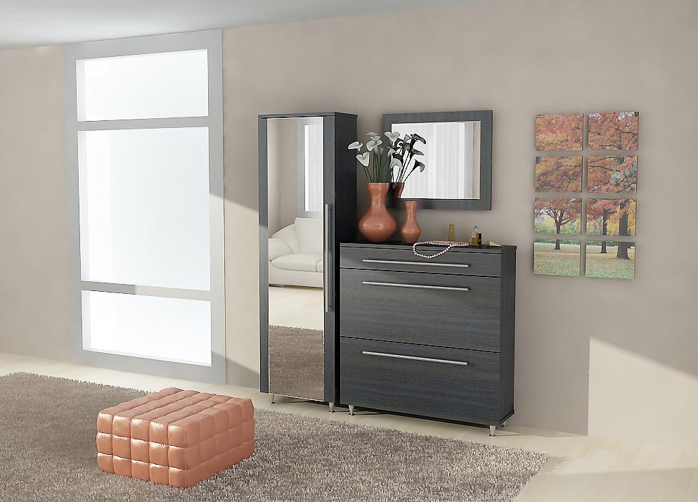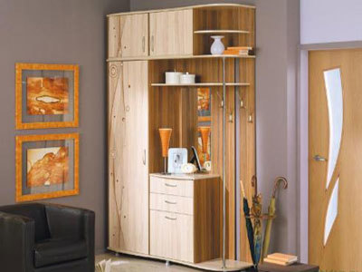 Поверхность фасадов декорирована легким рисунком. Края отделаны кромкой ПВХ. Прихожая комплектуется высоким шкафом, тумбой с выдвижными ящиками и небольшим зеркалом, открытыми радиусными полками на хромированной металлической опоре.