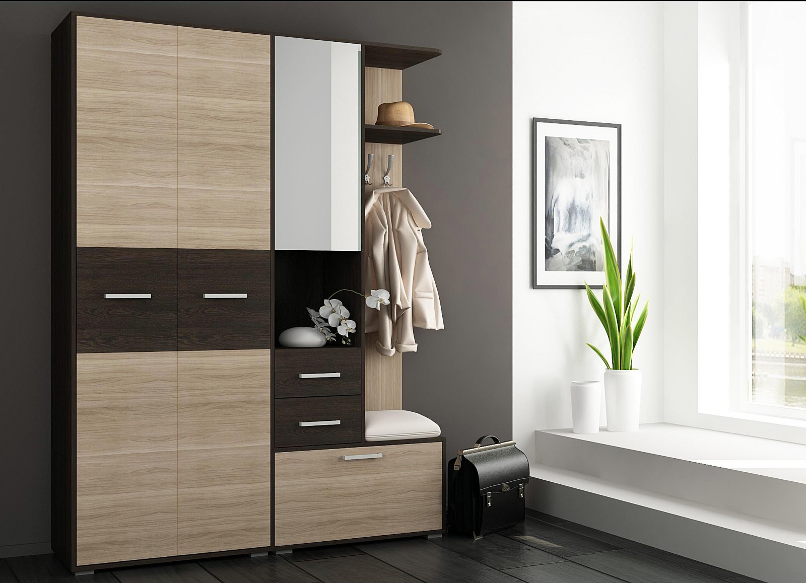 Небольшая прихожая, включающая в себя три модуля: шкаф, обувницу и зеркало. Цвет: венге.