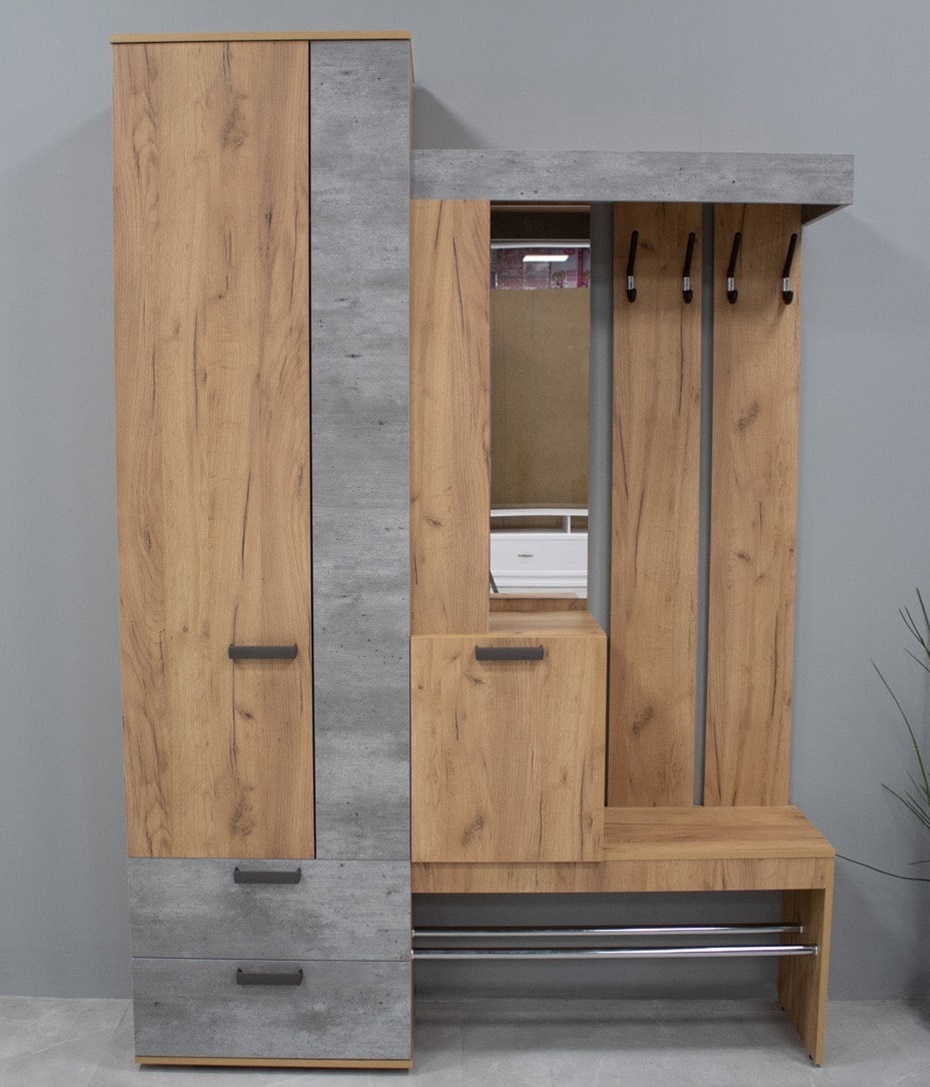 Прихожая «Трамп» вместительна и выполнена в необычном цветовом решении – Декор «Крафт»/Декор «Метрополитен Грей». Она легко впишется в небольшую квартиру, сохранив жилое пространство. Стильный дизайн, четкость и лаконичность линий, гармоничное сочетание цветов – здесь есть все, чтобы стать дополнением Вашего дома.