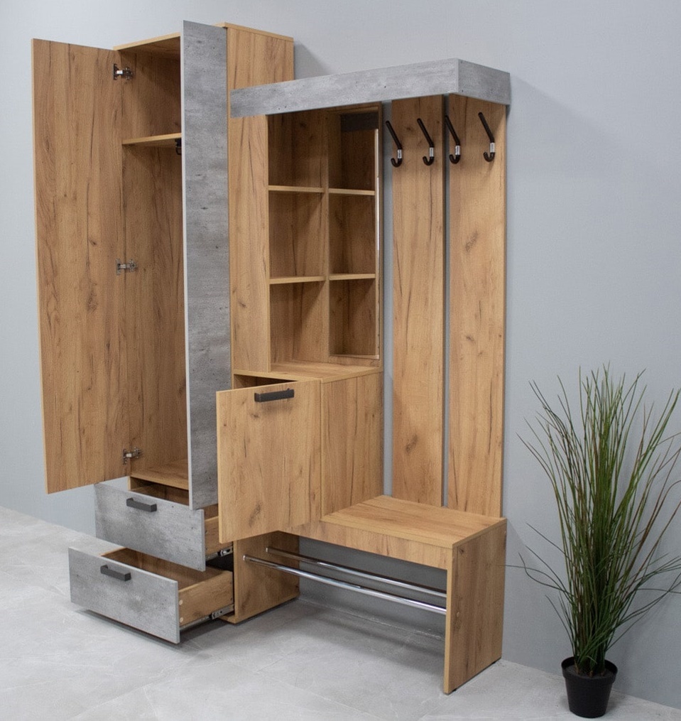Вешалка имеет верхнюю полку для головных уборов. Тумба содержит одну съемную полку внутри.