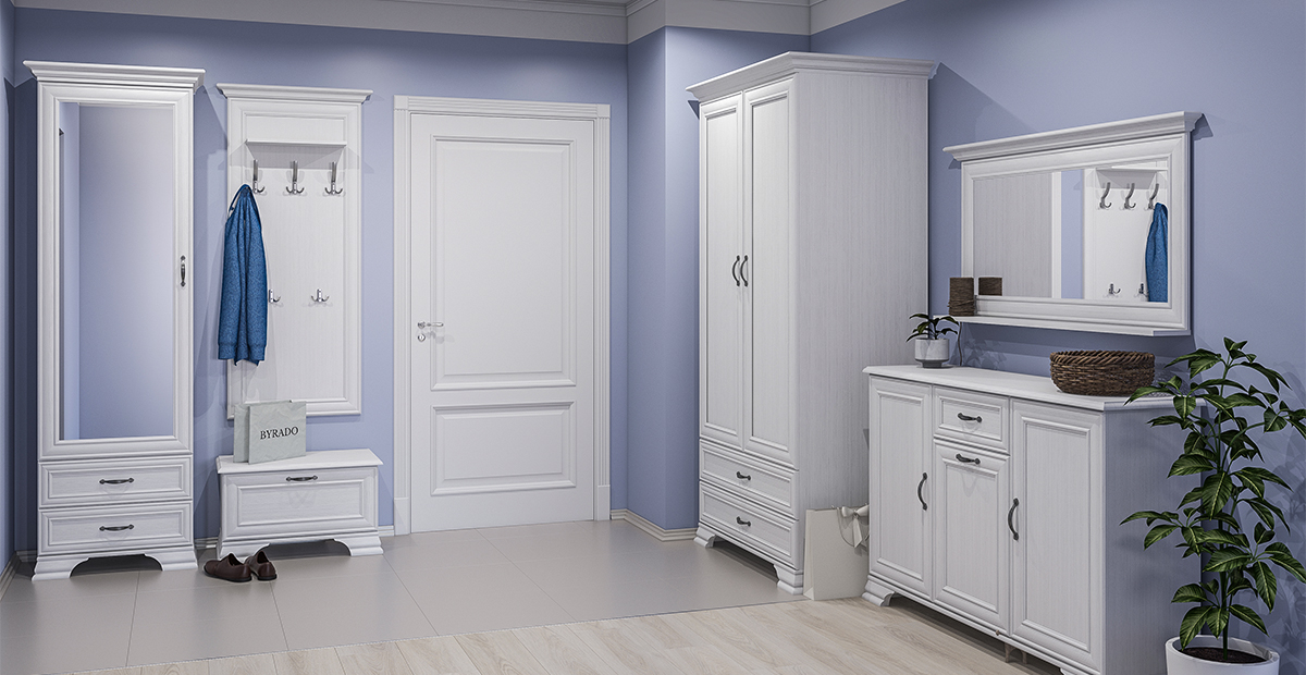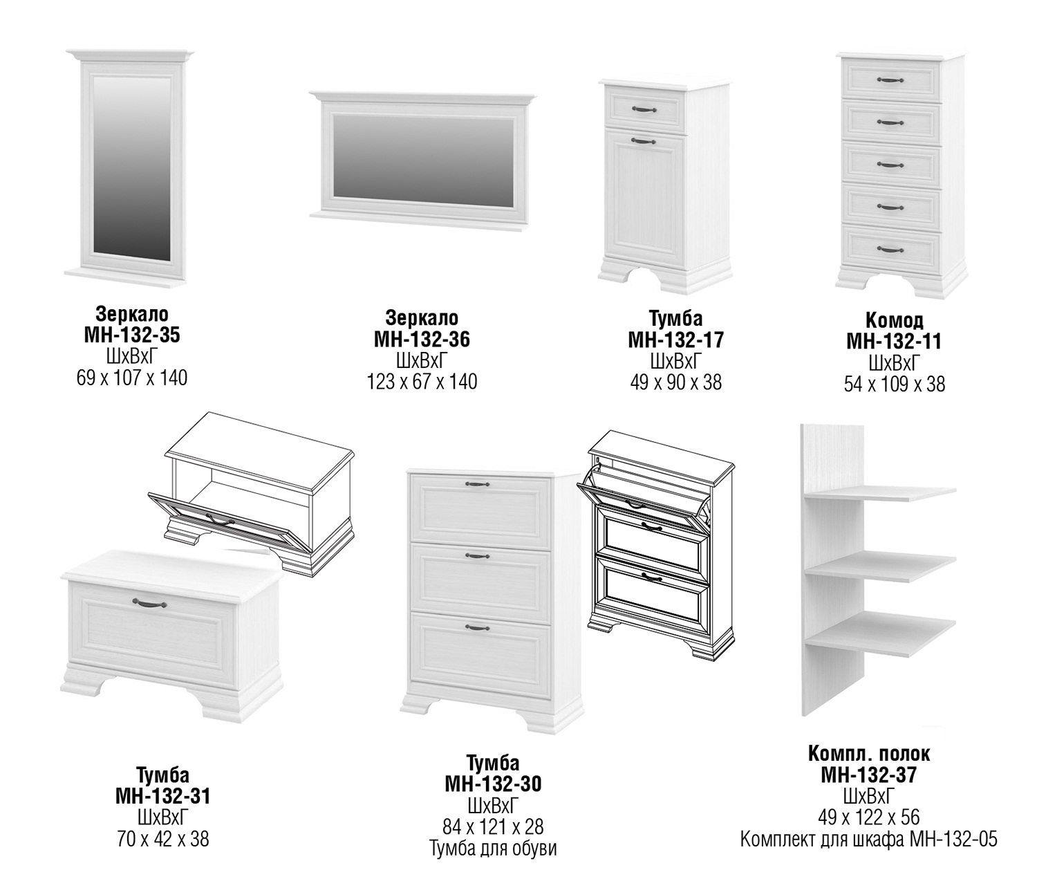 Модульная прихожая с белоснежными рамочными фасадами в классическом стиле. Стоимость указана за набор (6 элементов), изображенный на картинке. По желанию возможно убрать или добавить отдельные модули, итоговую стоимость уточняйте у продавца.
