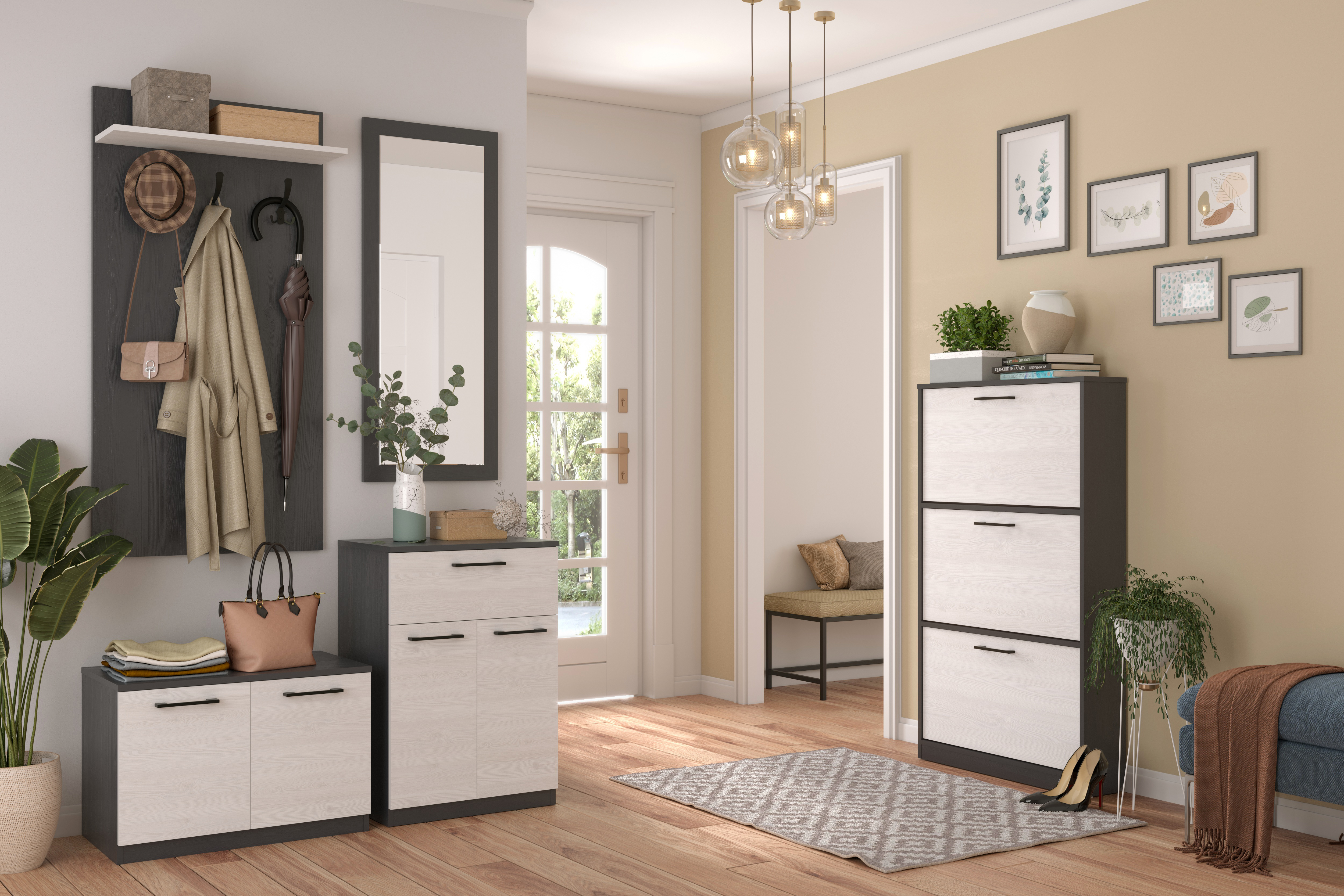 Прихожая с зеркалом, обувницей, крючками и шкафом.