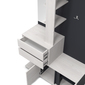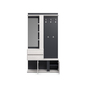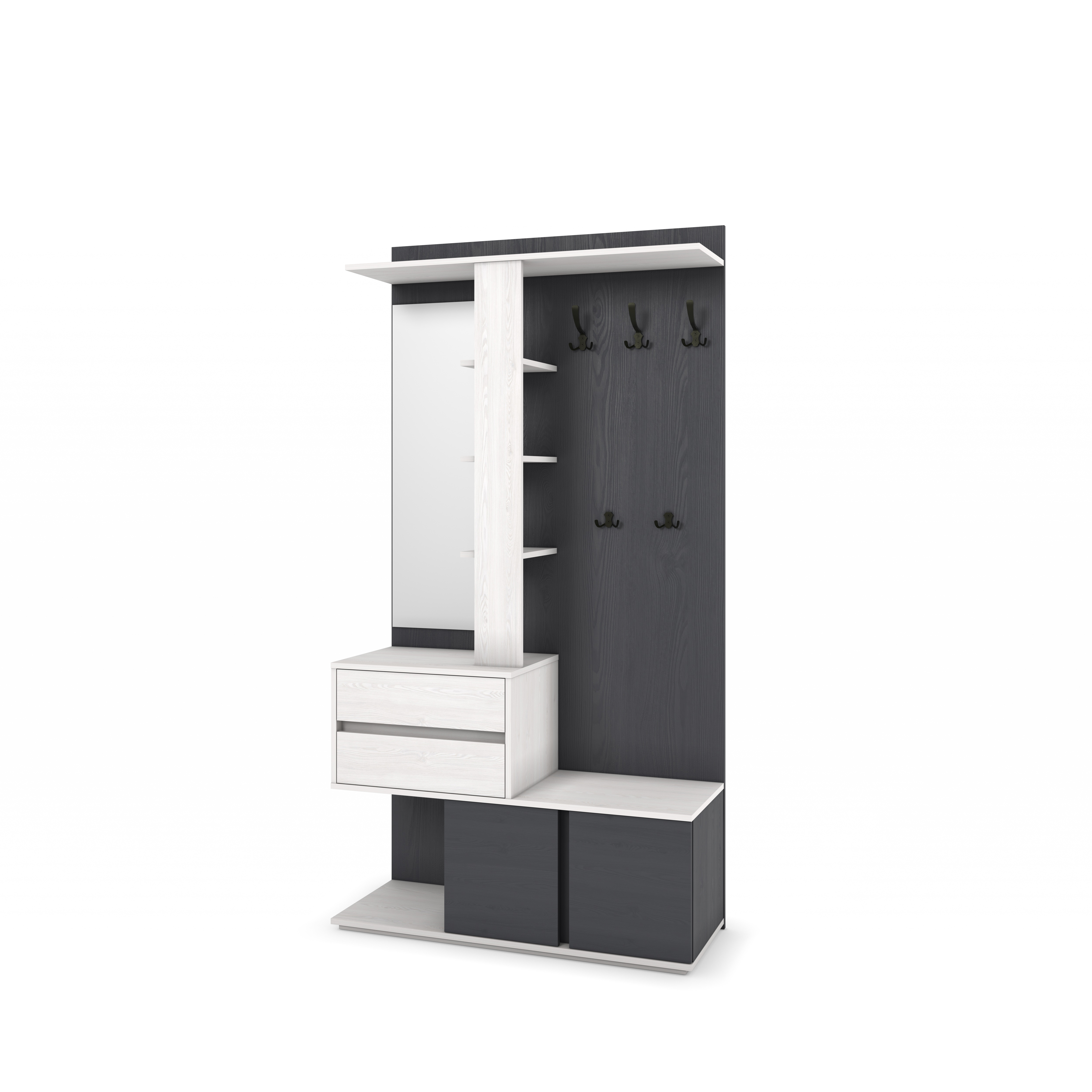 Вешалка справится с хранением большого числа вещей. Имеет несколько выдвижных ящиков, крючки для одежды, полки и зеркало.