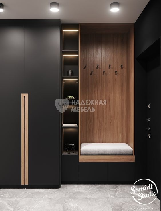 Двухдверный шкаф с интегрированной ручкой, ниши с подсветкой, мягкое сидение.