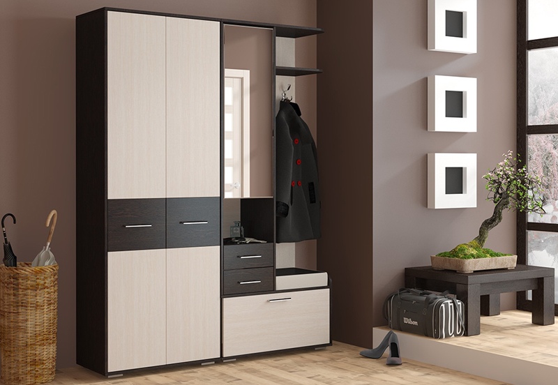 Вместительный гардеробный шкаф идет в комплекте с модулем, сочетающем в себе обувницу, пенал с зеркалом и панель с крючками для верхей одежды.
