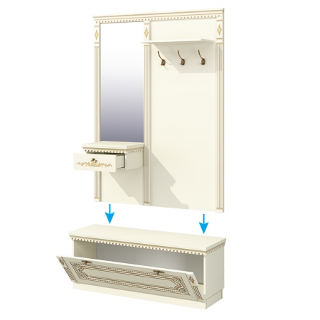 Элегантный набор в прихожую выделяется кремовыми фасадами и роскошным золотым декором. Стоимость указана за набор (2 элемента, без встроенного шкафа), изображенный на картинке. По желанию возможно убрать или добавить отдельные модули, итоговую стоимость уточняйте у продавца.