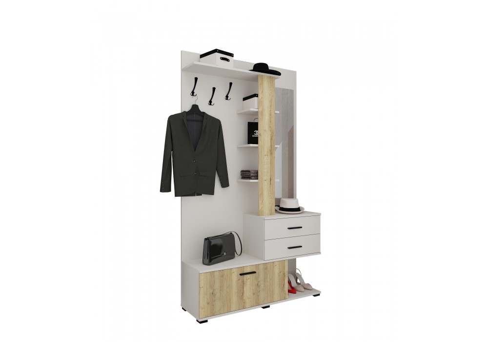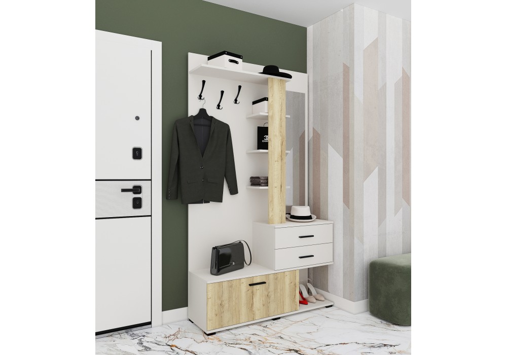 Компактная прихожая с двумя шуфлядами, зеркалом, тумбой для хранения обуви, открытой антресолью и зоной с крючками для одежды.