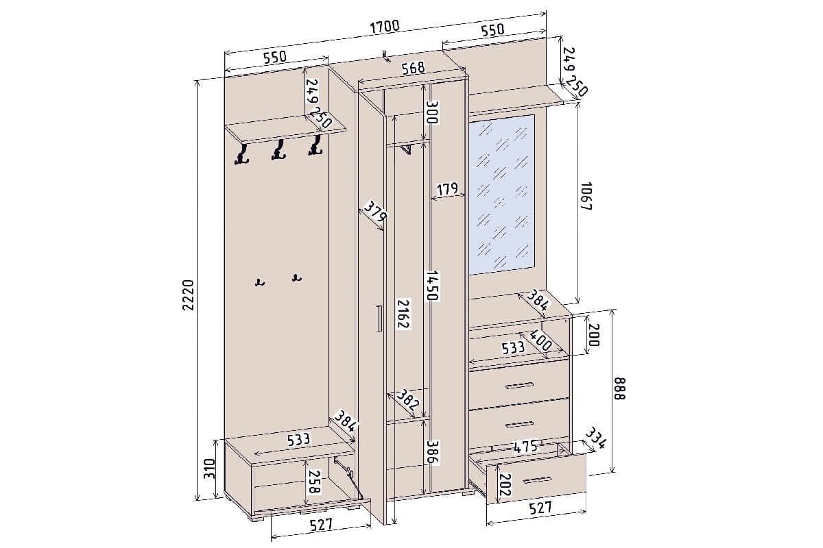 Состоит из отдельностоящих модулей: шкафа+ вешалки+ зеркала и обувниц.
