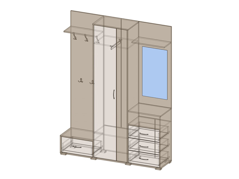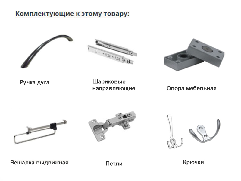 Фурнитура: ручка дуга, шариковые направляющие, крючки, петли, мебельная опора, выдвижная вешалка.