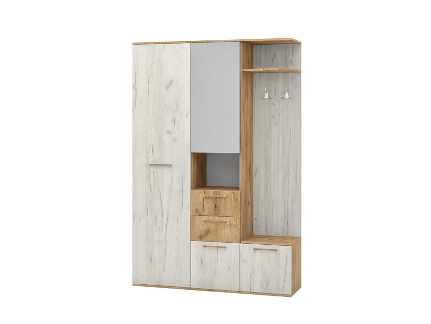 Модульный набор с угловым шкафом, комодом, зеркалом, обувницей и открытой вешалкой.