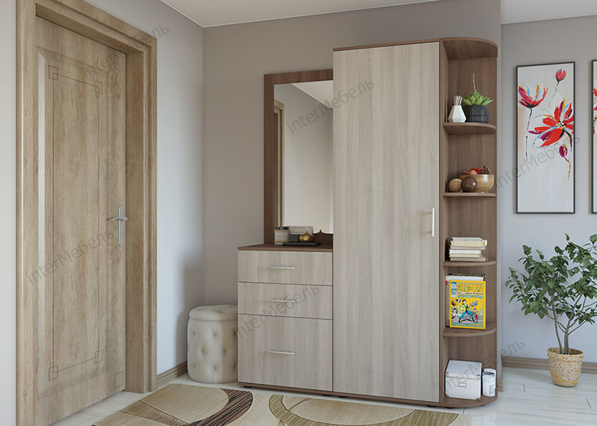 Модульный набор с угловым шкафом, комодом, зеркалом, обувницей и открытой вешалкой.