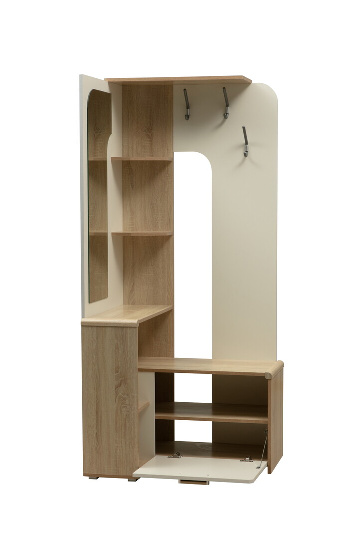 Вешалка с обувницей, два пенала с ящиками, угловой шкаф, открытая обувница.