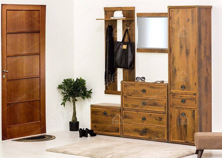 В состав набора включены: Вешалка настенная для верхней одежды в прихожую, Комод в прихожую с 4 ящиками, Низкая тумба скамья для обуви 1D, Зеркало настенное, Шкаф пенал с полками.