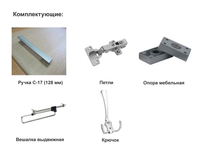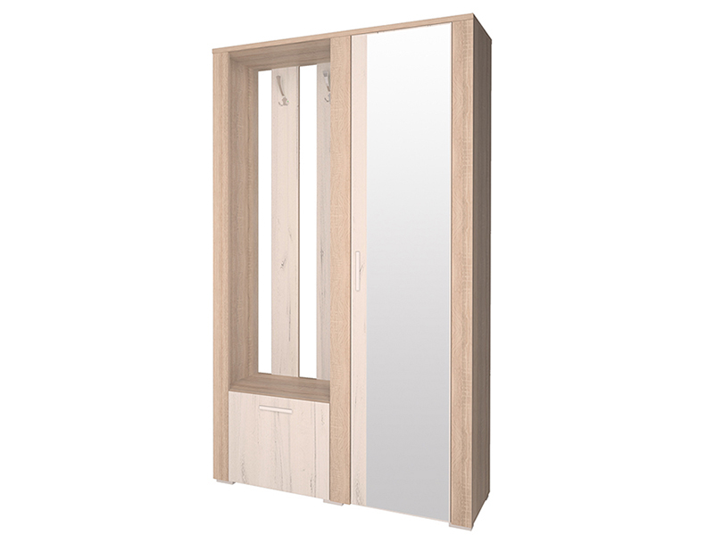 Стенка с вешалками, штангой для шарфов и полкой для головных уборов; подвесная тумба с зеркалом.