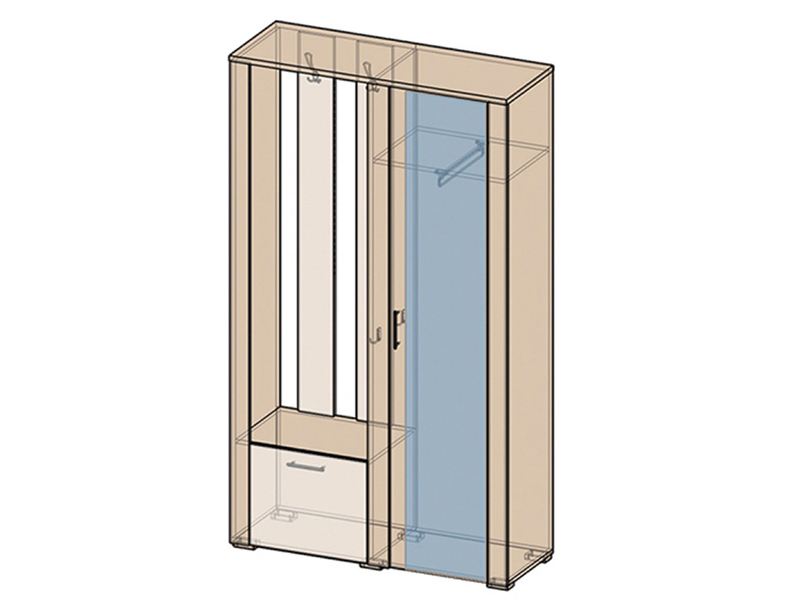 Полки, крючки, выдвижная вешалка, зеркало. Ширина 100 (50+50) см.