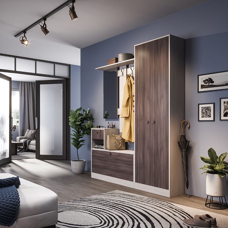 Внутреннее наполнение включает зеркало, три крючка, стационарную полку и выдвижную штангу. Облегчённая задняя стенка из ХДФ позволила удешевить производство без ущерба для внешнего вида изделия, а также уменьшить нагрузку на пол. Облицовка кромкой ПВХ толщиной 2 мм гарантирует сохранность привлекательного вида поверхностей даже в условиях активной эксплуатации.