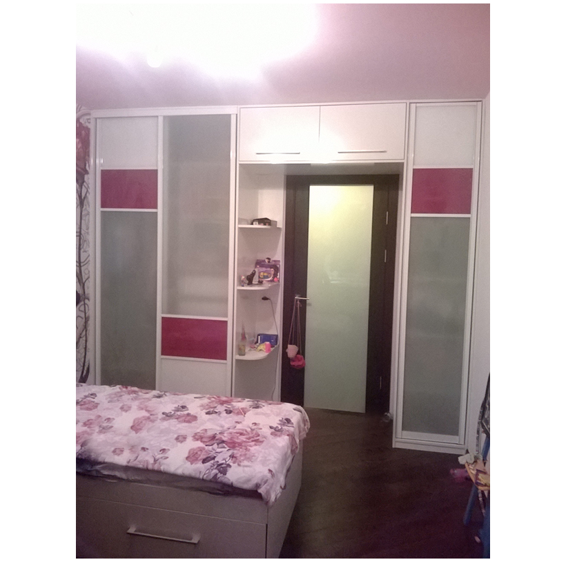 Шкаф-купе для большего удобства оснащен вместительными тумбами, оснащенными металлическими ручками. Створки шкафа украшают небольшие вставки красного цвета. В комплекте также имеется несколько полочек открытого типа.