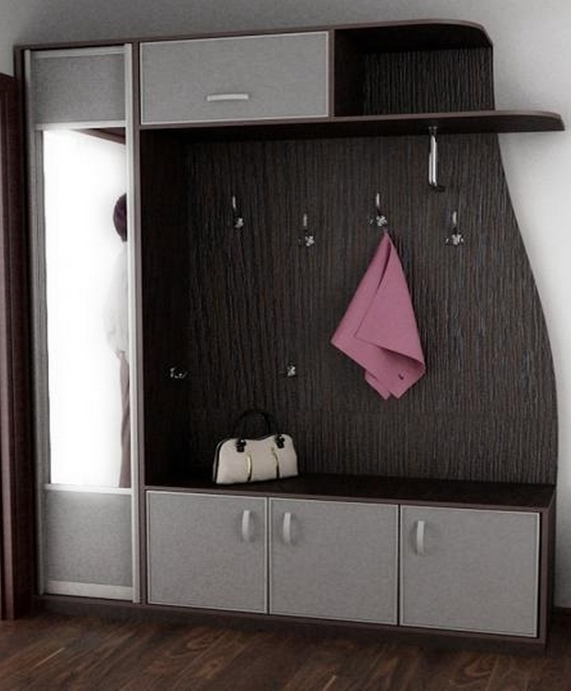 Практичная тумба с зеркалом, шкаф со штангой, вешалка для одежды и полки для вещей.