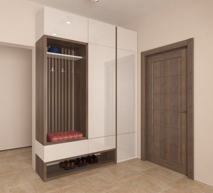 Белые глянцевые фасады без ручек, ниша для обуви, вешалка.