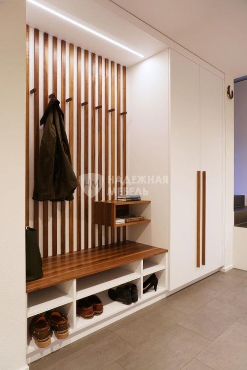 код 111438Модель прихожей со шкафом, нишами для обуви и панелью для одежды.