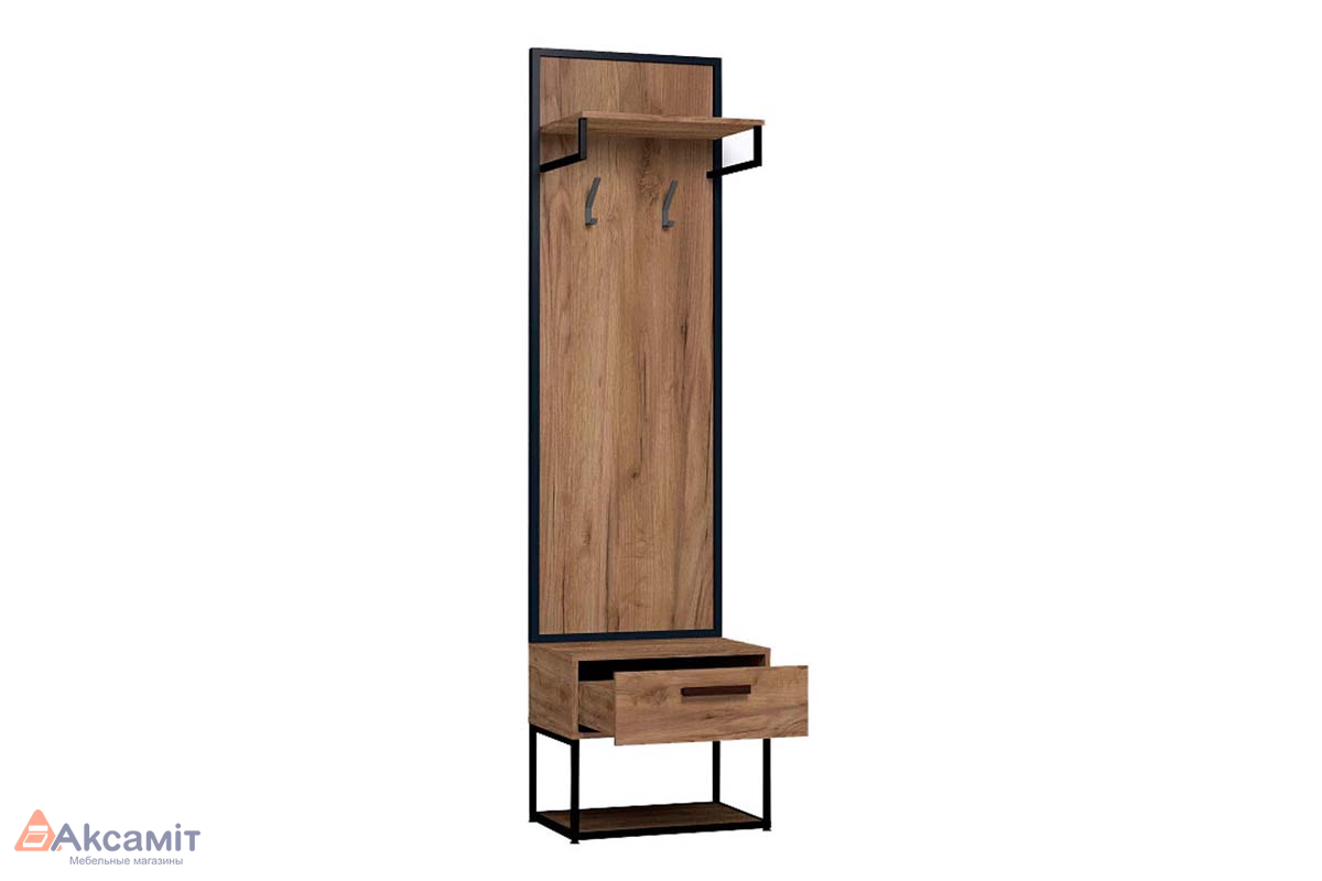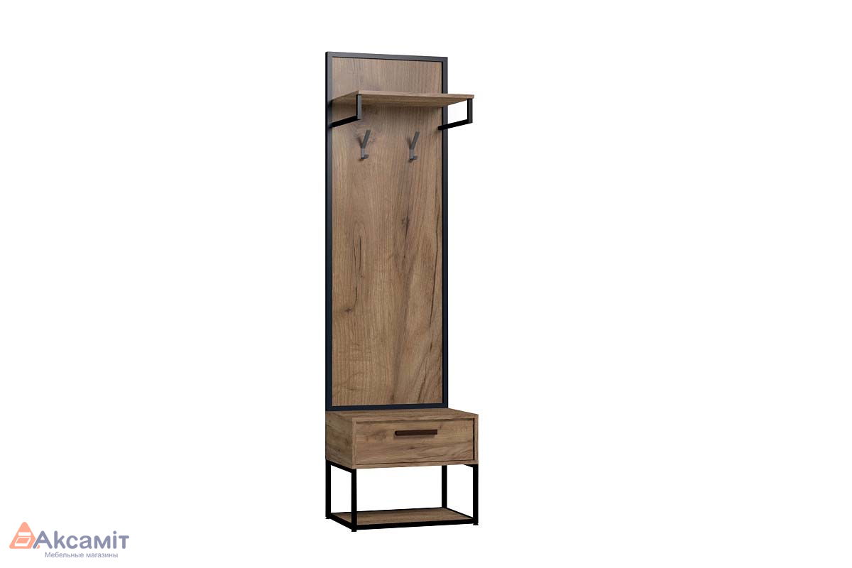 Открытая напольная вешалка поможет рационально обустроить даже небольшую прихожую, не загромождая пространство. Модуль состоит из вешалки, верхней полки, выдвижного ящика и открытой ниши. Полка для головных уборов крепится на профиль цвета Черный муар. Основание вешалки - профиль цвета Черный муар. Ящик оснащен шариковыми направляющими.