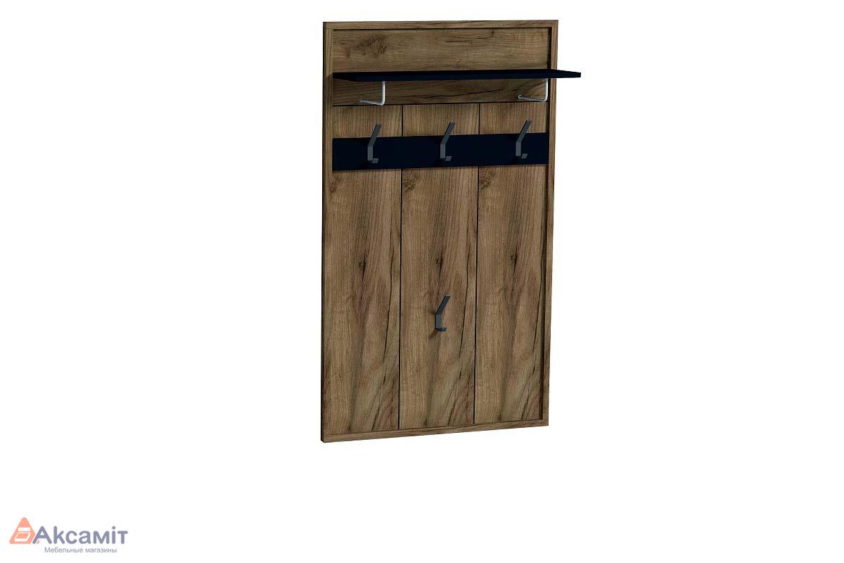Настенная вешалка поможет использовать пространство прихожей экономно и рационально. Панель оснащена полкой для головных уборов и крючками для верхней одежды и сумок. Верхняя полка глубиной 229 мм крепится с помощью Г-образного полкодержателя. Каждый металлический крючок для одежды выдерживает нагрузку до 5 кг. Детали из черного ЛДСП поддерживают стилистику всей коллекции и подчеркивают выразительность текстуры декора Дуб Табачный с его характерными для благородной древесины крупными трещинами и сучками.
