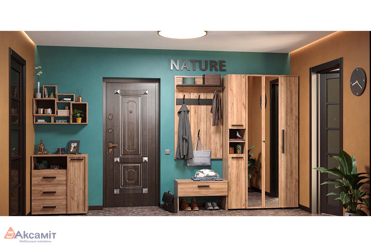 Стенка с вешалками, штангой для шарфов и полкой для головных уборов; подвесная тумба с зеркалом.