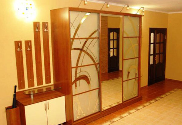 Оригинальный линейный шкаф-купе в прихожую с интересным наполнением дверей