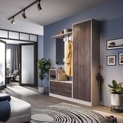 Универсальный набор мебели для узкой прихожей в темном древесном оттенке.